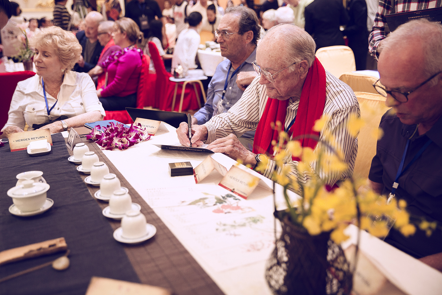 2015年9月5日,為紀(jì)念中國(guó)人民抗日戰(zhàn)爭(zhēng)暨世界反法西斯戰(zhàn)爭(zhēng)勝利70周年,大益集團(tuán)特別邀請(qǐng)66位美國(guó)援華老兵及其家屬回到昆明,由大益茶道院承辦了一場(chǎng)聲勢(shì)浩大的“英雄茶會(huì)”。茶會(huì)分為“歷史記憶”、“英雄歸來(lái)”、“和平萬(wàn)歲”三個(gè)環(huán)節(jié),大益職業(yè)茶道師精心布置了三十席抗戰(zhàn)紀(jì)念主題茶席,并為嘉賓沖泡品鑒“中美抗戰(zhàn)英雄紀(jì)念茶”——“飛虎傳奇”和“大益?zhèn)髌妗?。剛剛在北京接受了?xí)近平主席授勛的飛虎隊(duì)英雄老兵杰·溫雅德,美國(guó)空軍前參謀長(zhǎng)、四星上將羅納德·羅伯特·佛格曼將軍等紛紛上臺(tái)分享感受,美中航空歷史遺產(chǎn)基金會(huì)主席杰夫·格林代表老兵接受吳遠(yuǎn)之先生贈(zèng)茶。最后,全體中外嘉賓在代表中美兩國(guó)人民友誼的“和平紀(jì)念雙子塔”上鄭重簽名。這是一場(chǎng)特別的“禮席”,大益茶人以最高的東方式禮節(jié)向中美抗戰(zhàn)英雄老兵致敬。