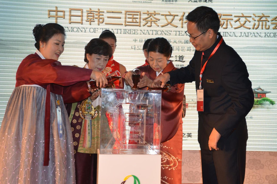 大益茶道院院長(zhǎng)吳遠(yuǎn)之先生與日韓茶人共同為首屆“‘茶之道’中日韓三國(guó)茶文化國(guó)際交流會(huì)”啟幕“