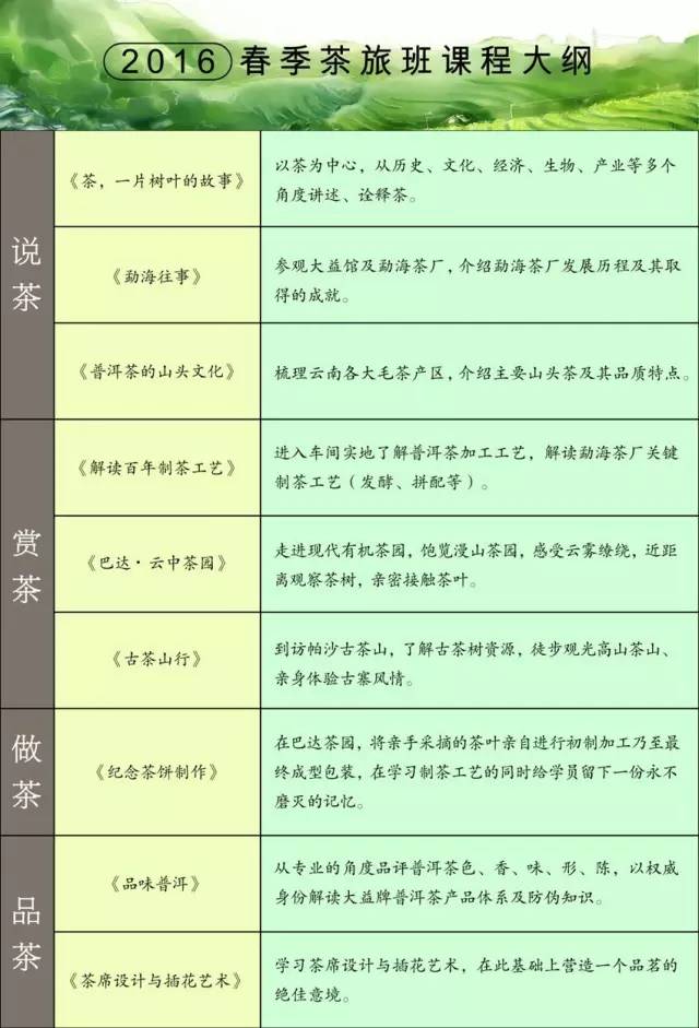 茶旅班 以愛茶、事茶者為招收對象,依托勐海之茶葉資源及勐海茶廠之制茶工藝,將專業(yè)講授與實地體驗相結(jié)合。認(rèn)證班 授課對象以茶業(yè)從業(yè)者為主。課程按國家職業(yè)標(biāo)準(zhǔn)設(shè)置,考試合格頒發(fā)證書。