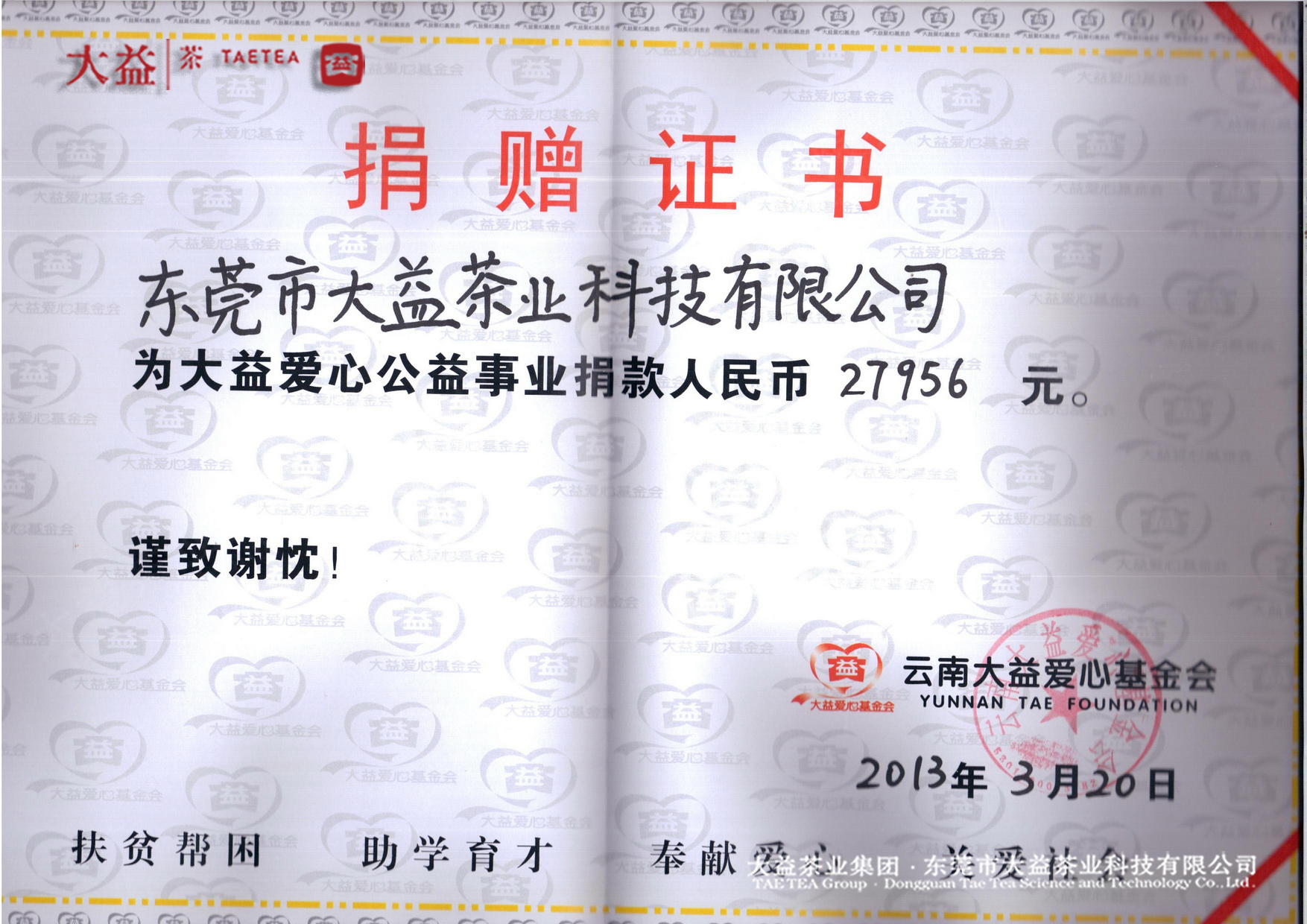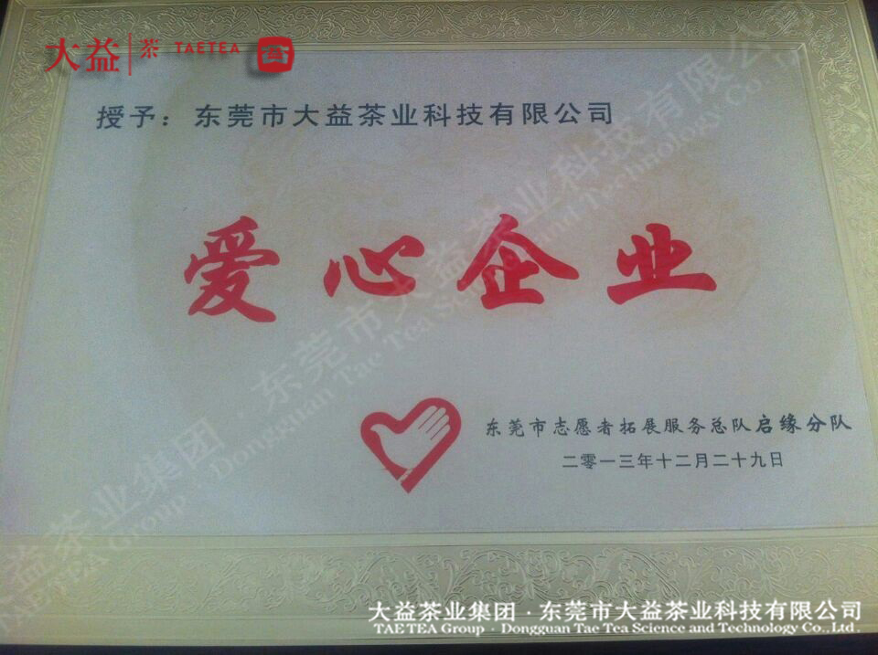 大益集團(tuán)非常注重于社會公益事業(yè)方面的投入,僅在最近幾年就累計投入數(shù)千萬元。東莞市大益茶業(yè)科技有限公司自成立以來,積極履行企業(yè)社會責(zé)任,始終堅持“成就于社會,奉獻(xiàn)于社會”的宗旨,積極致力于回報社會,參與社會各類公益事業(yè),以公平、開放、學(xué)習(xí)、自尊、自信的企業(yè)文化,關(guān)愛員工成長、工作和生活。關(guān)注社會公益事業(yè),做有愛心的茶企,是公司和大益人內(nèi)心的深切期許。