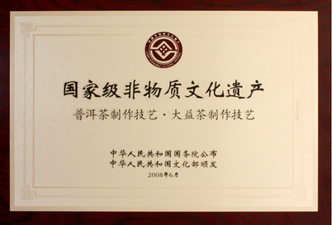 - 國家文化部頒發(fā),國家級非物質(zhì)文化遺產(chǎn) 大益茶制作技藝