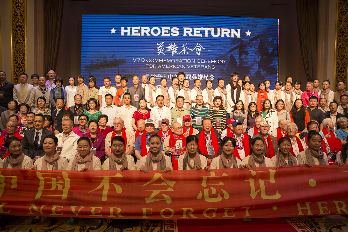 2015年9月5日,為紀(jì)念中國(guó)人民抗日戰(zhàn)爭(zhēng)暨世界反法西斯戰(zhàn)爭(zhēng)勝利70周年,大益集團(tuán)特別邀請(qǐng)66位美國(guó)援華老兵及其家屬回到昆明,由大益茶道院承辦了一場(chǎng)聲勢(shì)浩大的“英雄茶會(huì)”。茶會(huì)分為“歷史記憶”、“英雄歸來(lái)”、“和平萬(wàn)歲”三個(gè)環(huán)節(jié),大益職業(yè)茶道師精心布置了三十席抗戰(zhàn)紀(jì)念主題茶席,并為嘉賓沖泡品鑒“中美抗戰(zhàn)英雄紀(jì)念茶”——“飛虎傳奇”和“大益?zhèn)髌妗?。剛剛在北京接受了?xí)近平主席授勛的飛虎隊(duì)英雄老兵杰·溫雅德,美國(guó)空軍前參謀長(zhǎng)、四星上將羅納德·羅伯特·佛格曼將軍等紛紛上臺(tái)分享感受,美中航空歷史遺產(chǎn)基金會(huì)主席杰夫·格林代表老兵接受吳遠(yuǎn)之先生贈(zèng)茶。最后,全體中外嘉賓在代表中美兩國(guó)人民友誼的“和平紀(jì)念雙子塔”上鄭重簽名。這是一場(chǎng)特別的“禮席”,大益茶人以最高的東方式禮節(jié)向中美抗戰(zhàn)英雄老兵致敬。