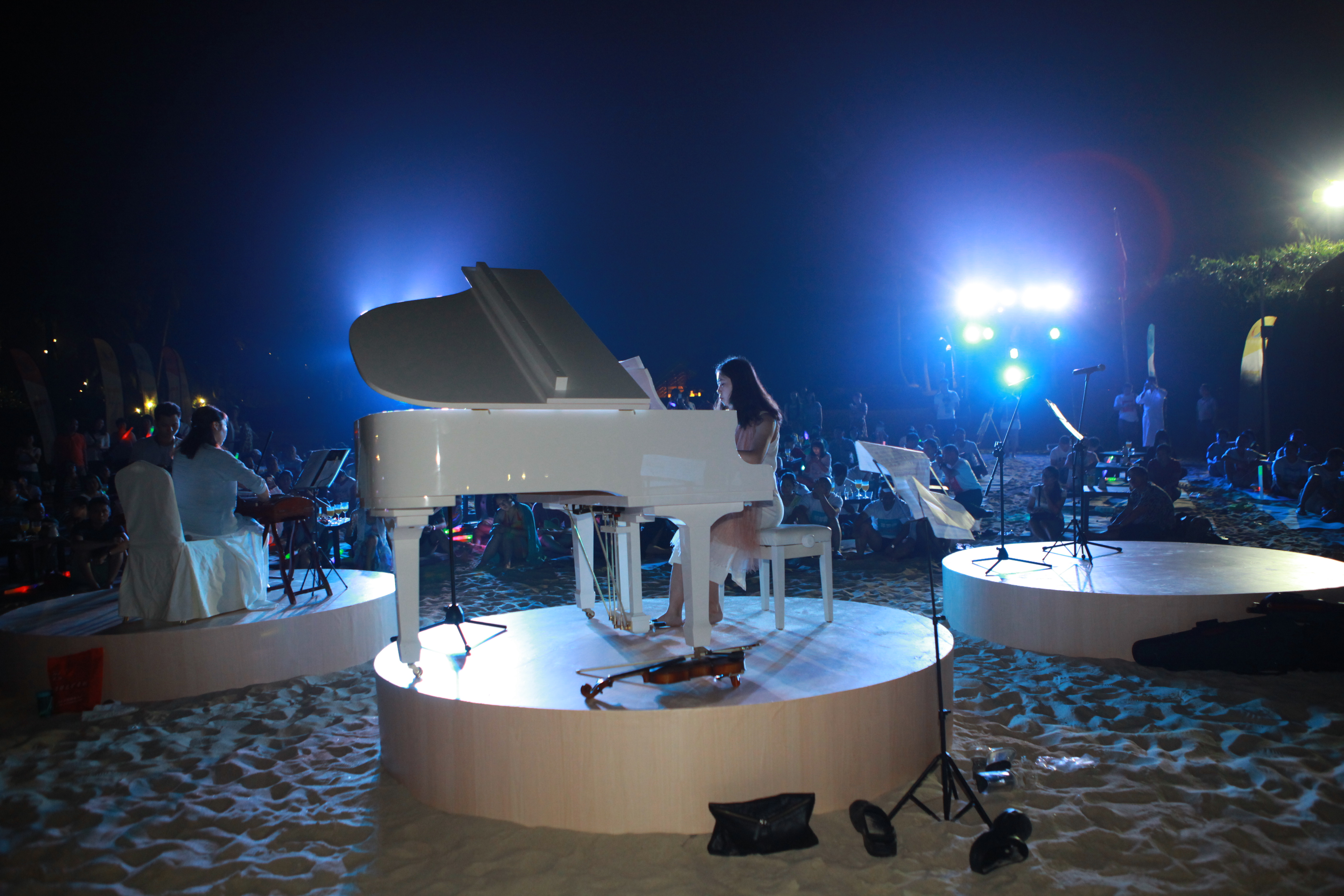 “新茶樂(lè)”則是大益茶道院首創(chuàng)的一種茶道音樂(lè)形式。所謂“新茶樂(lè)”不同于傳統(tǒng)茶樂(lè),其音樂(lè)風(fēng)格特別能彰顯茶席中那一份靜謐之美與靈動(dòng)之美,而西洋樂(lè)器與中國(guó)古典樂(lè)器的結(jié)合更加時(shí)尚,令人耳目一新。2015年10月18日晚,適逢大益嘉年華舉辦期間,“星海茶夜·心靈聆樂(lè)”沙灘音樂(lè)茶會(huì)在三亞海濱舉行。茶道院音樂(lè)教師郭乙霖和青年作曲家楊楠、青年演奏家耿林虎等共同演繹了系列“新茶樂(lè)”曲目,鋼琴、大提琴、竹笛、古箏,沙灘、海浪、星空、燭光……當(dāng)空靈絕美的音樂(lè)旋律在夜空中響起,所有人都為這無(wú)比美妙的一刻而陶醉。
